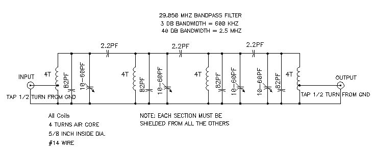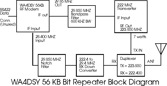 Eventually I'll write a description of the repeater, but for now here's the block diagram. Note that the repeater logic and FIFO is in the modem. No external logic is required. The 29 mhz filters were required at the Sweat Mtn. site to enhance the isolation above that provided by the Sinclabs 222 mhz duplexer. These were not required for the Lanier Mtn. site which uses a 5 mhz split ( 445.150 / 440.150 mhz) . A Motorola 4 cavity band pass/reject duplexer provided enough isolation.