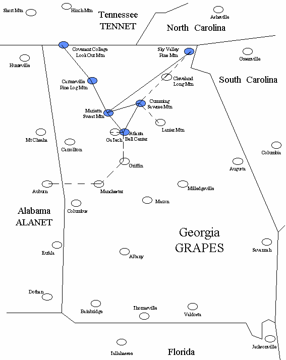 The solid lines are existing 56KB links and the dashed lines are links presently under construction. GRAPES has funded all the switch sites in Georgia, except the Internet Gateway at Georgia Tech. TENNET is sponsoring the Tennessee sites and those in Alabama are sponsored by ALANET .